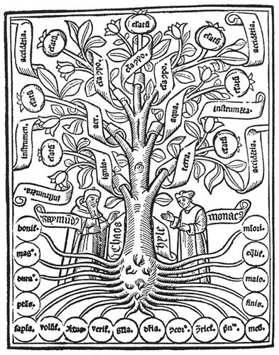 Depuis les plus anciennes cultures et religions, l’arbre, avec sa structure en bifurcations, son système de ramures et son feuillage protecteur, a toujours accompagné les hommes, représentant à la fois la prospérité, la fertilité, la force, le lien entre ciel, terre et monde souterrain et la connaissance. Il leur a ainsi fourni une image symbolique de la vie, de l'univers, et de la connexion divine, comme l'Arbre de vie, que l’on retrouve dans les cultures monothéistes ou païennes, et qui incarne l'idée que toute vie est interconnectée et sacrée. Apparaissant en même temps que l'arbre de la vie dans la Genèse, l'arbre de la connaissance du bien et du mal illustre une utilisation fondamentale du symbolisme de l'arbre pour marquer la distinction et la compréhension du savoir. Il figure parmi les utilisations fondamentales de la division des racines et des branches pour symboliser la divergence de concepts. L'influence que porte l'arbre de la connaissance au fil des siècles souligne la puissance symbolique de l'arbre ainsi que le lien fort qu'il tisse entre la croyance religieuse et la classification des savoirs. La classification s'opère ici par les branches et les racines. Les premières, au nombre de seize, présentent les grands domaines de la science que l'on peut lire sur les étiquettes enroulées autour des branches, et qui ont chacune un arbre dédié. Les dix-huits racines regroupent quant à elles en deux groupes, les neuf attributs divins (bonté, grandeur, éternité, puissance, sagesse, volonté, vertu, vérité et gloire) et neuf principes logiques (différence, concorde, contrariété, commencement, milieu, fin, majorité, égalité et minorité). Réalisé quelques siècles après la mort de Lull, il existe diverses variations de la représentation de cet arbre. Le chercheur et designer Manuel Lima a consacré la majeure partie de ses travaux à la visualisation de l’information, notamment par l’étude des modèles de classification. En intégrant la symbolique de l’arbre comme modèle de classification du monde dans un ouvrage intitulé Visual Complexity: Mapping Patterns of Information, il explique comment l’arbre a pu très tôt exprimer la diversité (par analogie avec ses branches) à partir d’une unité centrale (son tronc). On peut retenir de son étude deux principaux usages de l’arbre comme modèle épistémologique, le premier en généalogie, permettant d’illustrer la croissance et la subdivision des idées, des sujets, des personnes et des sociétés dans le temps, et le second en classification, créant une taxonomie systématique ordonnée et régulière des valeurs et sous-valeurs. Le premier exemple abordé par Lima dans la classification d’information est celui de l’organisation hiérarchique des connaissances proposée par Aristote dans Catégories. Basée sur dix catégories fondamentales regroupant des espèces subordonnées, cette organisation définit ainsi un modèle de classification en couches qui a servi durablement de modèle dans la philosophie occidentale. Les prédicables d'Aristote sont reformulés par le philosophe Porphyre dans son introduction à Categories d'Aristote (ou Isagogè), en cinq classes : genre, espèce, différence, propriété, et accident. Il introduit une structure hiérarchique de classification, connue sous le nom d’« arbre de Porphyre ». Le Liber figurarum, œuvre théologique symbolique de Joachim de Flore incarne une utilisation marquante de l’arbre dans la représentation et l’organisation des connaissances. Il s’agit d’une collection d'illustrations et de traités théologiques publiée après sa mort en 1202. Il représente un effort de systématisation des récits historiques, des événements et des relations sociales à travers la métaphore de l'arbre. Rappelons aussi ici l’Arbor scientiae de Ramon Llull précédemment cité qui organise les savoirs humains dans un arbre de la science, où chaque domaine est classifié dans un arbre dédié. Llull dresse ainsi un inventaire dans lequel il distingue les connaissances profanes (comme la physique et la politique) et religieuses (comme la théologie et l’astronomie), illustrant sa vision d’un savoir universel et interdépendant. Deux arbres additionnels servent d’outils pédagogiques, avec des exemples et des raisonnements clarifiant les concepts. Cette approche a influencé des penseurs comme Francis Bacon, René Descartes, et plus tard Gottfried Leibniz, contribuant ainsi aux fondements de la pensée scientifique et de l’informatique moderne. La volonté de rassembler l’intégralité des connaissances humaines dans un compendium est qualifiée d’encyclopédisme. Elle sera marquée par des œuvres monumentales comme la Naturalis Historia de Pline l’Ancien, une encyclopédie en trente-sept livres traitant des aspects du monde naturel et des réalisations humaines en art, architecture et médecine, ou l’ Etymologiae de Saint Isidore de Séville, qui organise une monumentale archéologie des savoirs comptant une vingtaine de livres puisant aux sources des auteurs antiques, ou plus tard au XIIIᵉ siècle, des ouvrages tels que De Proprietatibus Rerum de Bartholomeus Anglicus et le Speculum Majus de Vincent de Beauvais qui poursuivent cet effort d’organisation des connaissances médiévales. Ces ouvrages ouvrent la voie à l'Encyclopédie de Diderot et d’Alembert, comptant plus de soixante-dix-mille articles et environ trois-mille illustrations dans trente-cinq volumes. Diderot imagine alors l’encyclopédie comme un outil permettant de relier différentes sciences et d'encourager les lecteurs à explorer ces connexions, comme un organisme vivant et dynamique, favorisant l’expansion des connaissances et la création de nouvelles œuvres. Le modèle de l’arbre reste aujourd’hui omniprésent dans la sémantique de l’organisation des données et demeure essentiel pour représenter les structu