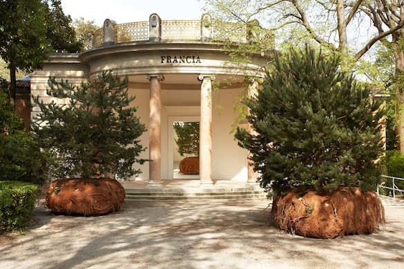 Céleste Boursier-Mougenot, transHumUs, 2015, pins sylvestres (Pinus sylvestris) de 4,5 mètres de haut, installés sur des plateformes en terre (composées de sol, de roches et d’argile) montées sur roues et se déplaçant au moyen de sondes Granier, moteur, capteurs de position (GPS) et des télémètres laser, œuvre présentée lors de l'exposition Rêvolutions, Pavillon Français, Biennale de Venise de 2015, commissariat d’Emma Lavigne, 9 mai au 22 novembre 2015.