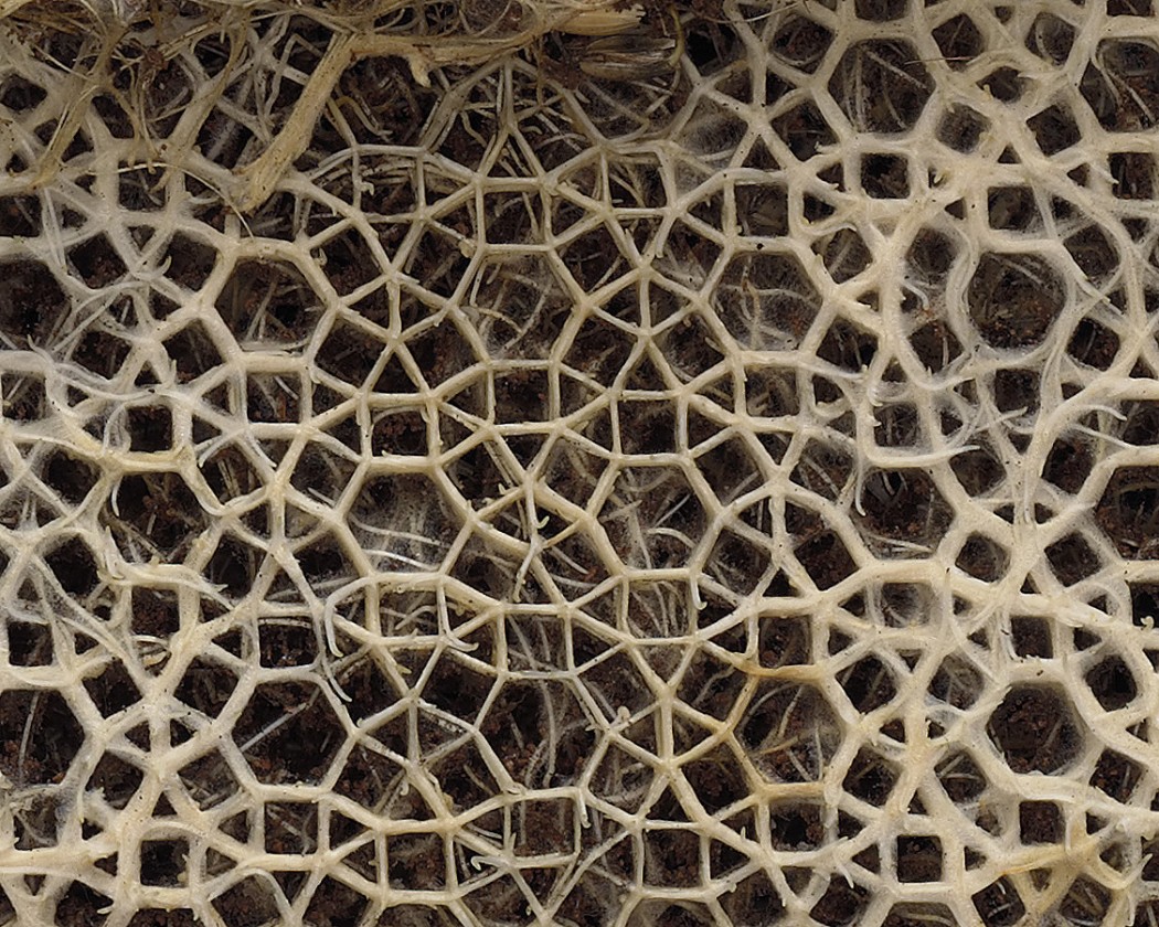 Les différentes stratégies d’occupation du sol sont très variées entre les espèces, favorisant différentes manières de s’étendre et d’exploiter le sol, fournissant ainsi de nouvelles ramifications qui viennent augmenter la plasticité des réseaux. Par exemple, comme nous explique Claire Atger dans l’article précédemment cité, la fourchaison favorise une forte expansion du système racinaire par la codominance d’axes. Elle permet une meilleure exploration en éloignant le volume absorbant de la base du tronc (le collet) et une conduction beaucoup plus élevée. À l’opposé, avec le développement de rejets, plusieurs racines peuvent naître au même point. Cette méthode est moins hiérarchisée mais elle maintient l’absorption des racines dans un volume restreint, optimisant l’exploitation de l’espace. Une tactique répandue est une opération conjointe de fourchaison et de rejets en superposition de plusieurs couronnes racinaires qui peuvent fusionner en socle. Cependant, ces stratégies sont déterminées génétiquement, ainsi certaines espèces optent pour le gigantisme, ne formant ni fourches ni rejet. Ces stratégies déterminent également les interactions entre les végétaux, en fonction notamment de la forme de leur système racinaire, qui favorise l'entraide ou la compétition. Néanmoins, même si la croissance du système racinaire est très hiérarchisée et suit un modèle architectural, ces systèmes restent théoriques et évoluent en fonction du terrain. Ainsi même si cette croissance suit une stratégie spécifique, elle n'est pas prévisible. Le développement racinaire est un processus dynamique qui dépend de beaucoup de facteurs et qui s'adapte à son milieu. Sa croissance peut ne pas être homogène en fonction du contexte de l'arbre, de ses contraintes et l’amener à adopter un comportement opportuniste, c’est-à-dire diriger ses racines vers les points d'intérêt. On estime qu’en forêt, 80% du volume des racines restent en surface peu profonde – aux alentours de cinquante centimètres, mais en fonction des besoins de l’arbre, l’extension maximum du réseau racinaire peut monter à un rayon de quatre-vingt-dix mètres à l’horizontal pour la forêt tropicale et de soixante mètres à la verticale dans le désert. Les plantes ont donc une plasticité racinaire qui leur permet de s’adapter en fonction de ce qu’elles perçoivent de leur environnement. Par exemple, si de l’acide abscissique (hormone de réponse au stress hydrique), s’accumule dans une zone sèche du sol, la plante va réprimer la formation de ses racines latérales. Au final, comme le rappelle Marc Brillat-Savarin, nous voyons que l’arbre trouve toujours le moyen de s’adapter grâce à cette plasticité. Ainsi en milieu urbain les racines ont tendance à se diriger vers une source d'eau, ou encore, face à des vents forts, l'arbre développe davantage ses racines du côté du vent pour s'ancrer. Ses motifs s’inspirent du monde naturel et botanique en reprenant des structures géométriques des cellules, des flocons de neige ou des coquillages. En combinant design et science, l’artiste évoque l’équilibre écologique actuel entre l’homme et la nature. Elle reprend les principes géométriques et d'ordonnancement de la nature pour nous livrer une représentation poétique du désir humain de contrôler la nature. À travers sa pratique, l’artiste révèle non seulement la vitalité des plantes, mais aussi leur incroyable capacité d’adaptation. Elle l’explique ainsi :