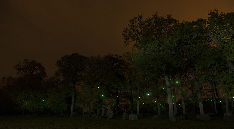Erik Samakh, Les fées lucioles, 2016, installation de lucioles solaires sur le site de mégalithes de Pleslin-Trigavou, à l’occasion du festival d’art contemporain L'Art au fil de la Rance, [en ligne], https://www.documentsdartistes.org/artistes/samakh/repro2.html