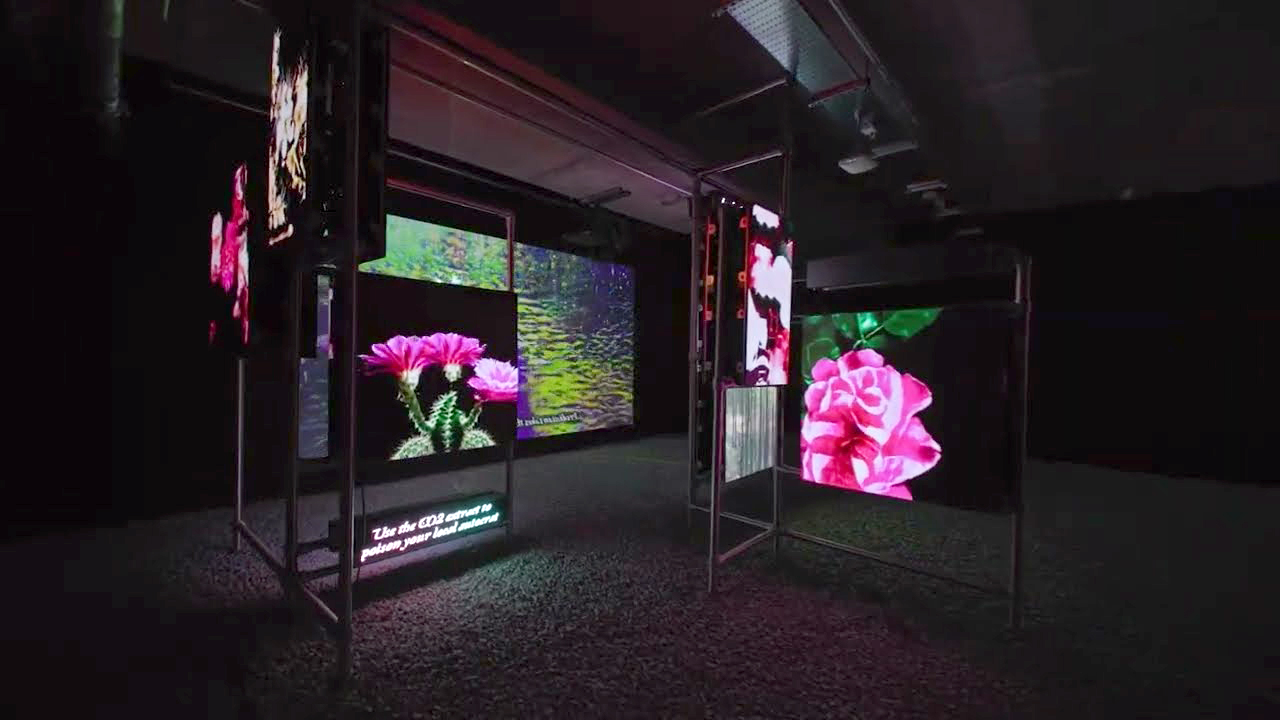 Hito Steyerl, Power Plants, 2019, structures d’échafaudages en inox, panneaux LED, boucle vidéo multi-canaux, panneaux de texte LED, texte vidéo en boucle, Serpentine Galleries (2019), Londres, Centre Pompidou (2021), Paris, [en ligne], https://www.centrepompidou.fr/en/ressources/oeuvre/tvqchnA