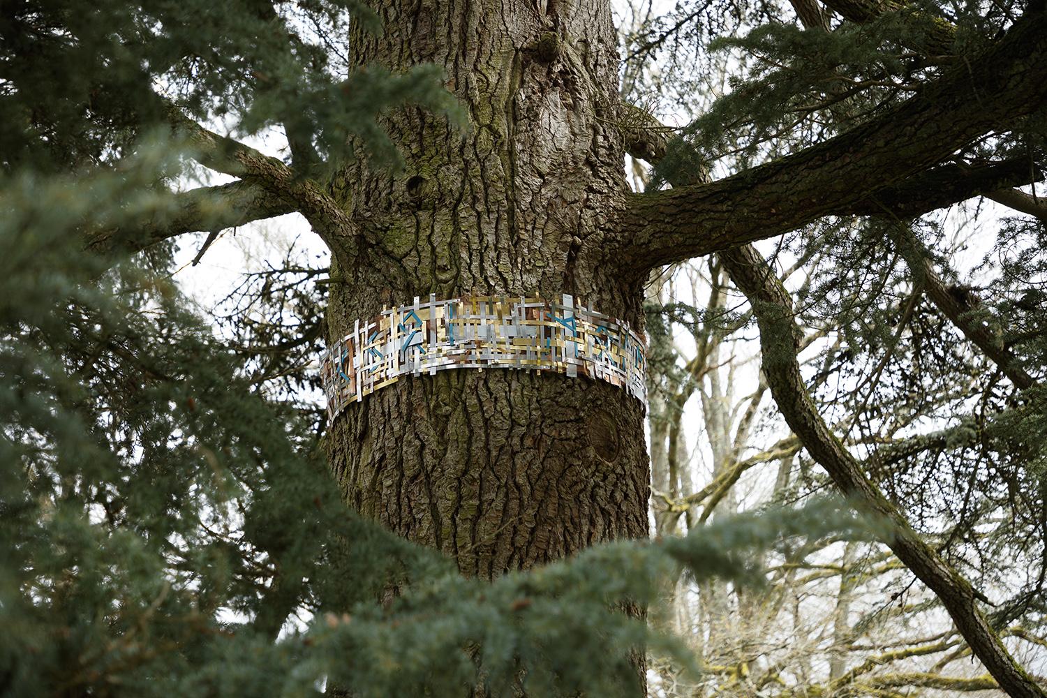 Olga Kisseleva, Armille, 2024, sculpture tissée en forme de bracelet autour du tronc d’un cèdre, conçue à partir de métaux précieux, Domaine de Chaumont-sur-Loire, [en ligne], (https://domaine-chaumont.fr/fr/centre-d-arts-et-de-nature/saison-d-art-2024/olga-kisseleva). Fig. 19