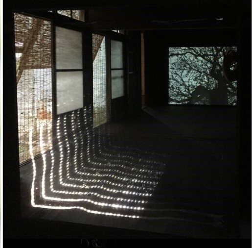 Olga Kisseleva, EDEN: The cries and Whispers of Trees, 2018, installation lumineuse transmettant en temps réel les relevés biométriques de trois cèdres (d’Australie, de France et du Japon) mis en relation par le dispositif T2N/T2T, accompagnée d’un montage vidéo des cèdres observés, présentée à la Triennale Echigo-Tsumari, Japon.