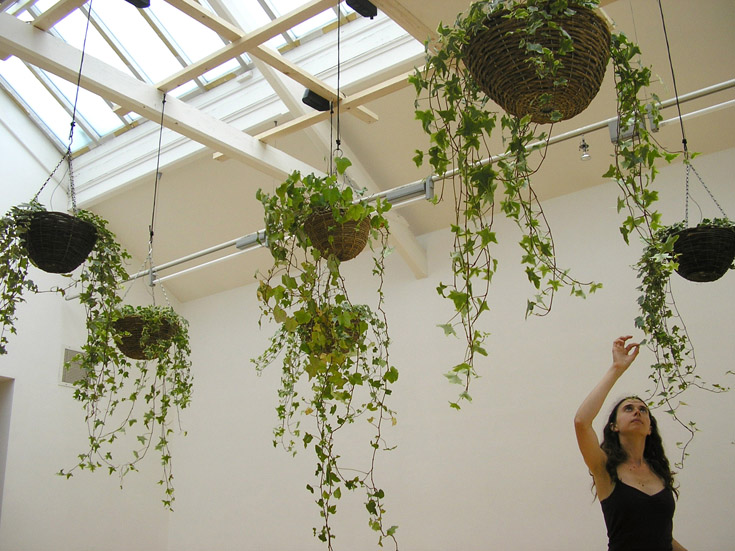 Scenocosme, Akousmaflore, 2007, installation interactive composée de végétaux suspendus à une structure en bois et équipés de capteurs de vibration, dispositifs électroniques et système audio (5:1), première exposition à la Galerie Charlot, Paris, [en ligne], https://www.scenocosme.com/akousmaflore.htm