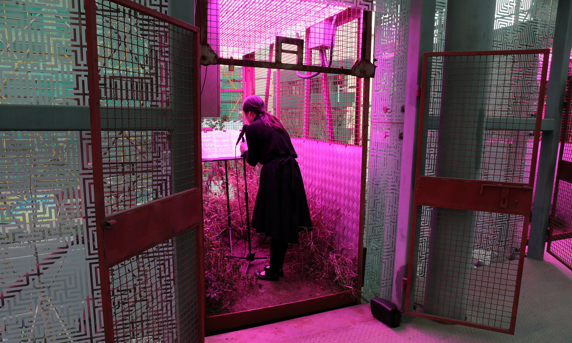 Zheng Bo, Kindred, 2017, installation composée de cinq cages d'ascenseurs industriels désaffectés contenant des plantes sauvages transplantées et éclairées par des lampes LED de culture, présentée lors de l'exposition Precariat's Meeting au Ming Contemporary Art Museum (McaM), Shanghai, [en ligne], https://zhengbo.org/2017_KND.html